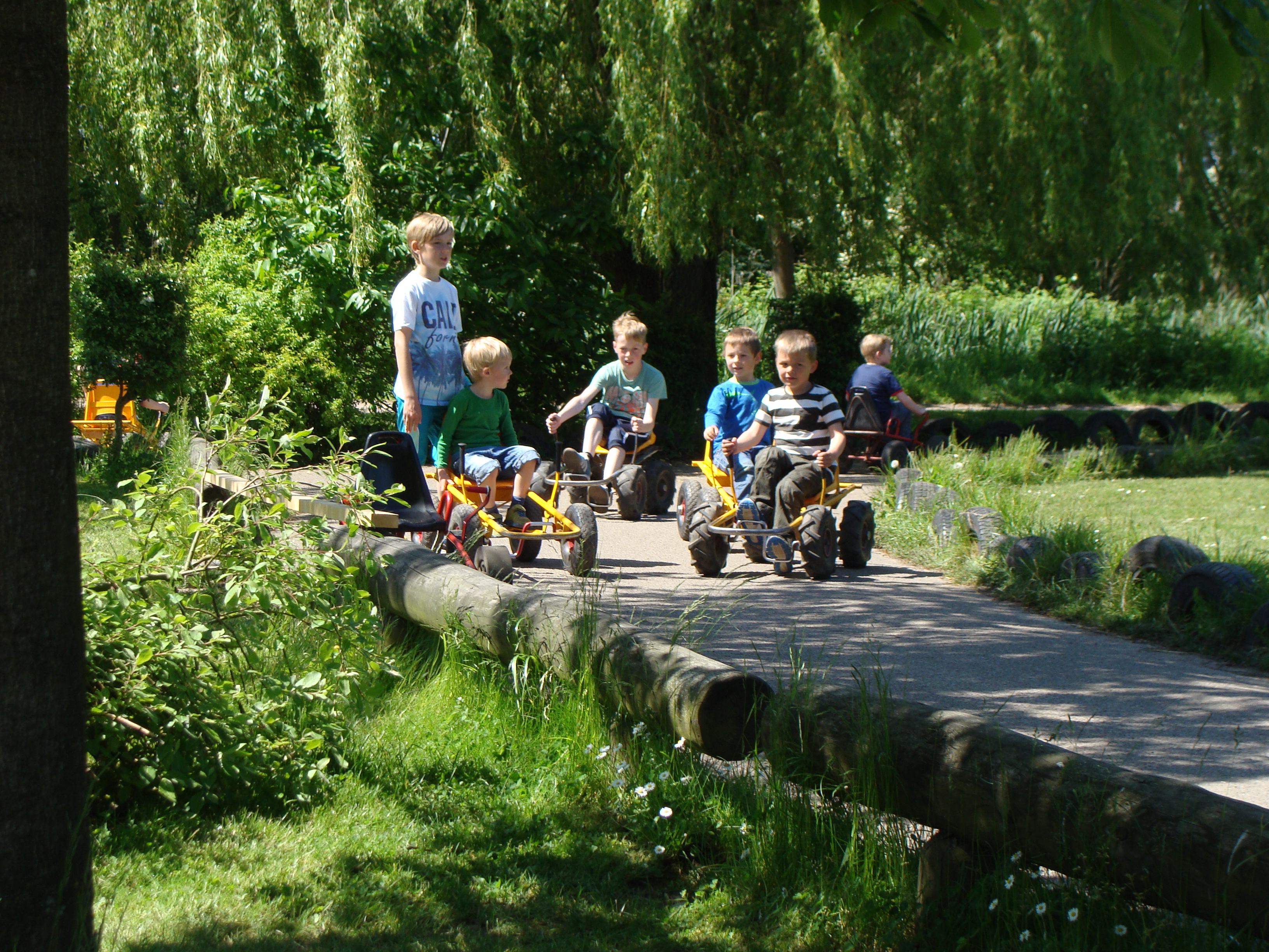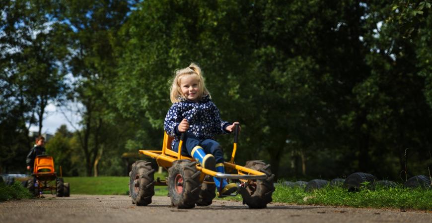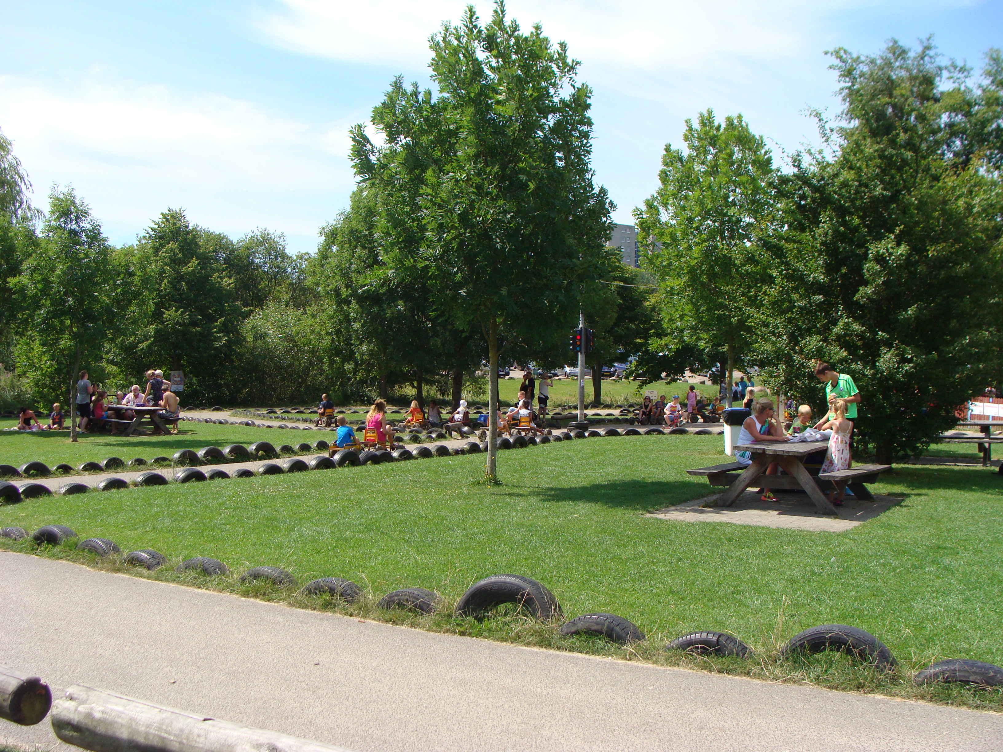 De kan køre om kap med vennerne, mens de voksne hygger sig ved et af de mange bordbænke-sæt i området.